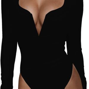 HERMOCO Women's Low Cut Bodysuit Sexy Leotards Deep V Neck Long Sleeve Body Suits Tops |
