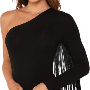 Verdusa Women's Fringe Trim One Shoulder Long Sleeve Bodysuit Top |